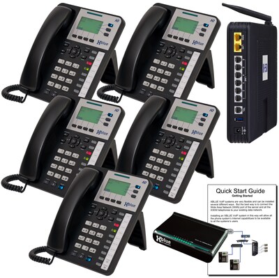 Description This XBLUE X50 VoIP System Bundle Includes Everything You Need To Install Your Own VoIP Telephone System Professional installation and programming fees can easily double or triple your cost in a new phone system. You eliminate these costs when you purchase an XBLUE phone system because our innovative "Do-It-Yourself"? design makes it very easy for you to s elf-install your own phone system. XBLUE offers "live"? US based pre and post sales support; our experienced engineers are ready to assist you! We will help you select the best system for your needs and help you with the initial setup, and then be there for you throughout the life of your XBLUE system. XBLUE’s innovative “Do-It-Yourself” design makes it very easy to self-install which saves you money by eliminating expensive professional installation and programming fees. XBLUE offers “live” US based pre and post sales support; our experienced engineers are ready to assist! The 11 programmable buttons of the X3030 phone means every user can place and retrieve calls from hold for each outside phone line connected to the system Connect your choice of up to (6) traditional telephone company lines and/or up to (8) XBLUE certified VoIP telephone lines for a total system capacity of (14) outside telephone lines and up to (24) X3030 IP Phones. Remote X3030 phones can be located off-site (home office, remote office) and operate exactly the same as system phones located at the main office. This XBLUE X50 VoIP System Bundle Includes Everything You Need To Install Your Own VoIP Telephone System This XBLUE X50 VoIP system bundle includes everything you need to install your own VoIP telephone system.  Included in this bundle: (1) X50 VoIP System Server  (5) X3030 IP Phones w/power adapters  (1) 8 port Data Switch  (6) Ethernet cables  (6) Telephone line cords  (1) X50 System Quick Start Installation GuideThe X50 server included in this bundle supports your choice of up to (6) traditional telephone company lines and/or up to (8) XBLUE certified VoIP telephone lines for a total system capacity of (14) outside telephone lines and up to (24) X3030 IP Phones - no additional hardware needed! The X50 includes popular business features like Automated Attendant, Voice Mail system with individual boxes for every user, Call Announce Intercom / Paging, Caller ID, Hold, Conferencing & Call Forward to Cell Phones. A Standard Cordless phone can be easily connected to the X-50 system enabling mobile access to answer incoming calls and features like voicemail, hold, transfer and paging.  The X3030 VoIP phones included in this bundle are specially designed to fully integrate and automatically connect to the X50 system. The X3030 telephone has all of the most commonly used features pre-programmed on the phone.  The X3030 phone has (11) programmable buttons which means every user can have a dedicated telephone line button for each outside phone line. This makes placing and retrieving calls from “Hold” as simple as just pushing a button. This eliminates the often complicated process of transferring phone calls. These buttons can also be used for one-touch access to other phones, system features or Speed Dial. The Multi-Color LEDs of each programmable button light up when other phones or lines are busy, which means you can quickly see at a glance who is on the phone or which line is in use.  The X3030 is a HD capable VoIP phone with a full duplex speakerphone & a backlit 6-line display to view Caller ID, Call Logs and Phone Book. The X3030 includes a built-in 2 port data switch to connect your PC to the network via your telephone so no extra wiring is required.  Each X3030 telephone comes with an ethernet cable and a plug in power adapter. The X3030 is also PoE (Power Over Ethernet) compatible.   X3030 IP phones can be located off-site (home office, remote office) and operate exactly the same as system phones located at the main office. The remote user can access lines, make intercom calls and use systems features in exactly the same manner as users at the main office.  Features like Hold, Speed Dial, Voicemail and the (11) programmable buttons with Multi-Color LEDs are all fully functional.  The X50 supports both traditional telephone company and VoIP phone lines.  You can choose XBLUE certified VoIP Telephone line service or feel free to continue to use traditional telephone lines, or choose both, it’s up to you!  The X50 supports up to (8) VoIP LInes. VoIP line service is delivered over your Internet Broadband connection, and includes unlimited local and long distance calls in the United States and Canada.   In the event of a local power failure, network failure or Internet outage the XBLUE failover feature forwards all incoming calls to a cell phone or other remote phone number. In most cases you can keep your existing phone number. Additional local and toll free numbers are also available.   XBLUE offers high quality “live” pre and post sales phone support by calling us toll free or send us a message via our website. Our US based technical support staff is ready to assist!  So please call us with any questions you might have regarding the purchase of an XBLUE phone system or anytime after your purchase for free real time personal assistance. Specifications Color Family : Black Conferencing Features : Yes Expandable Handsets (max) : No Bluetooth Compatible : No Call Waiting : Yes Caller ID : Yes Corded Handsets Included : Yes Cordless : No Cordless Telephone Handsets Included : Yes Cordless Telephone Headset Included : No Digital Answering : Yes Digital Answering System : Yes Expandable : Yes Headset Jack : No LCD Display : Yes Mute Feature : Yes Speakerphone : Yes Telephone Hold Function : Yes Telephone Number of Lines : 5-Lines or more Telephone Paging locator : No Telephone Speed dial : No Telephone Type : Multi Line Telephone Volume control : Yes Wall Mountable : Yes Corded or Cordless Phone : Corded Phone Bran