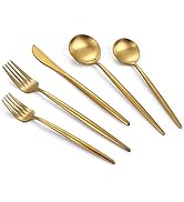 The VANVRO Matte Gold Silverware Set is a 20-piece, rust-resistant flatware collection designed for service of four. Made from durable 18/0 stainless steel with a chic matte gold satin finish, it combines lightweight comfort with dishwasher-safe convenience, perfect for elevating both everyday meals and special occasions.