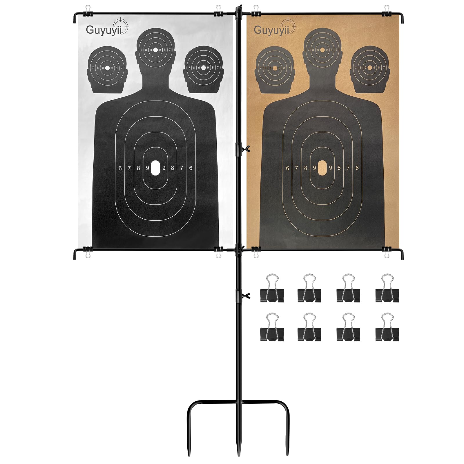 The Guyuyii Adjustable Height Target Stand is a versatile, weather-resistant metal frame designed for easy, tool-free assembly and stable outdoor use. It supports dual paper targets up to 17"x25" with 8 metal clips, anchored by 3-prong spikes for superior steadiness. Ideal for BB guns, airsoft, and firearm training, it offers customizable height and width adjustments, making it the perfect portable solution for shooters seeking reliable, flexible practice gear.