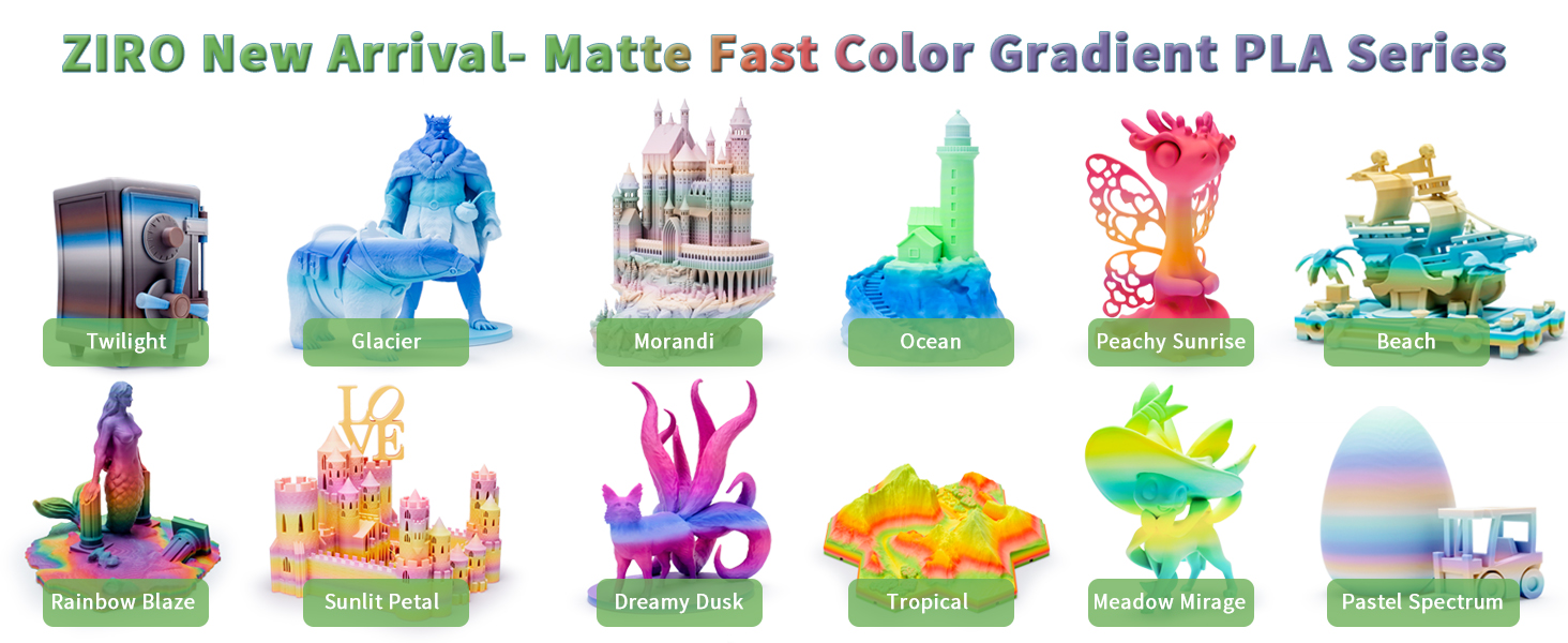 - [Fast Color Change Matte PLA]- The ZIRO "Rainbow Blaze" combined multiple colors in one matte pla filament. Higher-cost production technology to achieve the true faster color changing aim. The matte surface offers a no shine look, giving your 3D works a unique style.