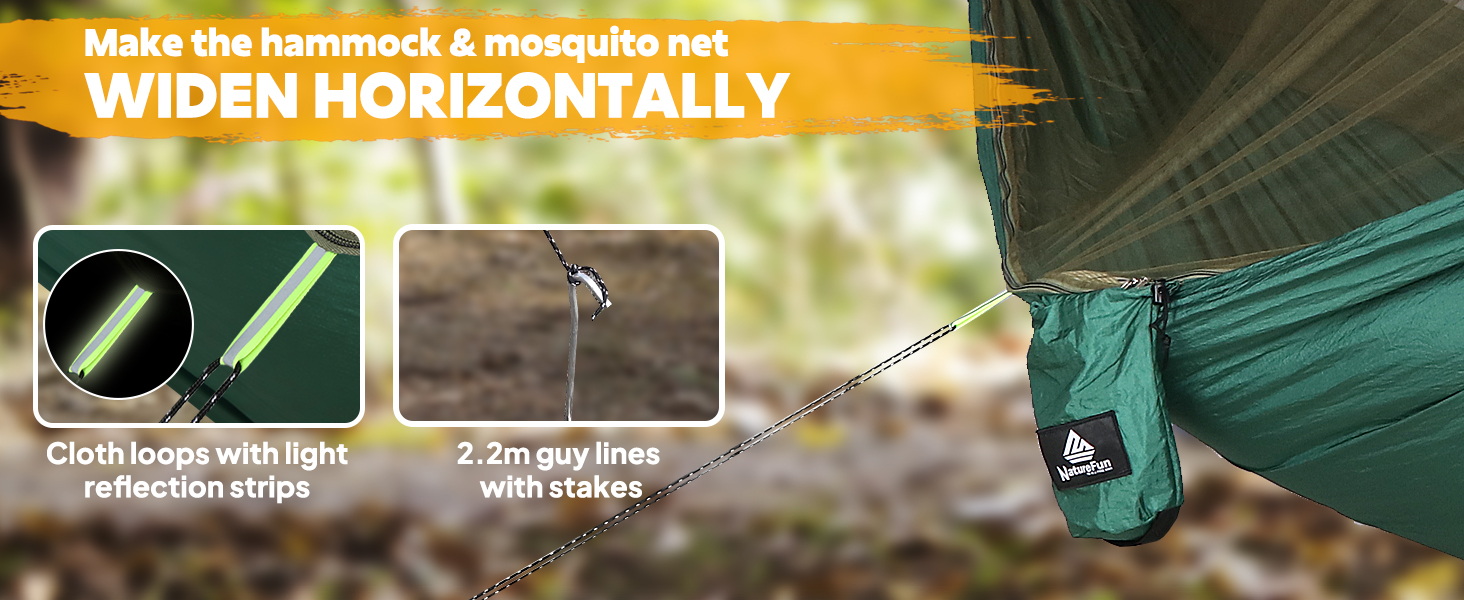 This hammock is lightweight durable and comfy it's elasticated over head line helps keep the bug net out your face if you are camping with this it does not come with a tarp for over head but overall I am very happy with the purchase I have camped in Scotland and England with this advised to get an under quilt if camping somewhere where it can be cold as under quilt gives a layer of insulation between you and outside elements without this in any hammock can get very cold