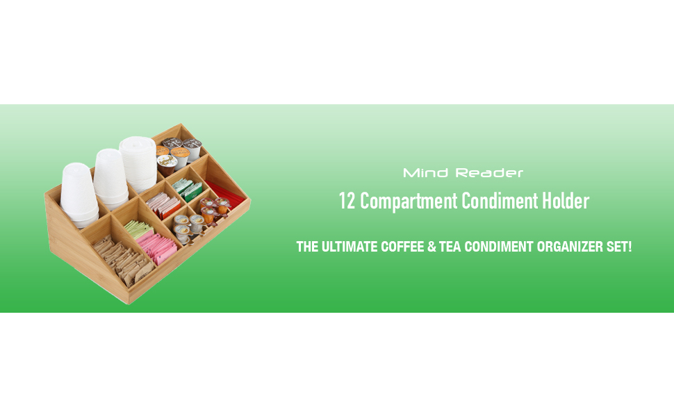 The Mind Reader 11 Condiment Organizer is a durable, lightweight bamboo two-tier organizer measuring 18 x 10 x 6.5 inches. Featuring 11 compartments, it efficiently stores coffee and tea accessories, condiments, and small office essentials, making it perfect for office breakrooms, home kitchens, or hospitality areas seeking a stylish, space-saving solution.