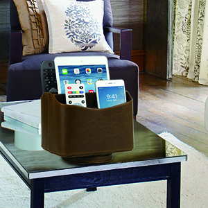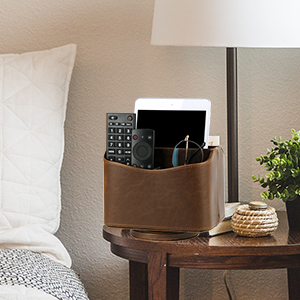 The media could not be loaded. I was originally looking for a remote holder that hangs over the arm of our sofa. But I found this while searching a new Amazon. I like this better. It has room for remotes, tablets, old handheld games, head phones and my cheater eye glasses. I ordered the classic brown over the dark brown. The lighter brown goes great with out end tables. It really declutters the top of the end table.