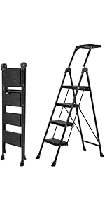 This ladder is a little workhorse! It doesn’t take up a lot of space so I keep it handy right behind the door in my laundry room. It is lightweight, very sturdy and easy unfold and fold back up! I love the little tray that fits on it! Makes it easy to keep nails and hammers or screws and screwdrivers close by and accessible during your project. At 61 years old, I feel very comfortable and secure going up and down this ladder.