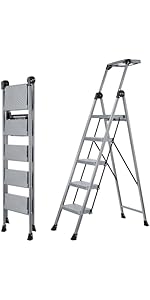 I don't review much but I bought the silver, 5 step unit a month ago. Affordably priced. Prompt delivery.My ex came over yesterday to, of all things, borrow my ladder. When she saw mine she didn't borrow, instead ordered one for her apartment last night. Will be there tomorrow.Completely sturdy considering light weight. Does not flex or wobble. Wide steps make it stable and safe to stand up on fourth rung. Not sure I want to try fifth, but doubtless if well braced it would do fine. Great for indoor or outdoor.Hinges are strong and not greasy. They do not bind at all. Quick and easy to open and collapse. Handily stores just about anyplace, in closet, under bed, hung on wall. Fits in trunk no problem.Three nice features are the collapsible handle, the removable tool tray, and the affixed velcro strap to bind it shut for storage.Every once in a while one company or another demonstrates it ge genuinely puts the consumer ahead its profit margin. Somebody did their homework designing this step ladder.Five stars+