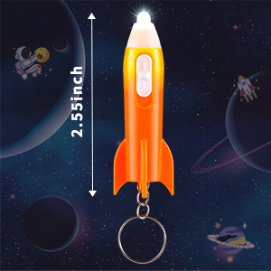 The Space Party Favors pack includes 36 mini rocket flashlight keychains, each measuring 2.55 inches. Made from durable PVC, these colorful flashlights are perfect for kids' parties, camping trips, and everyday use. They easily attach to keys or bags, making them a practical and fun accessory for any adventure.