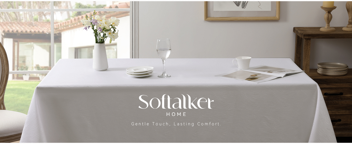 The Softalker Jacquard Rectangle Tablecloth (52 x 70 inches) features a stylish swirl damask pattern on heavyweight 210 GSM polyester. Designed for durability and ease, it offers 95% waterproof and stain resistance, wrinkle-free wear, and simple machine wash care—perfect for professional hosts seeking a blend of elegance and practicality for all occasions.