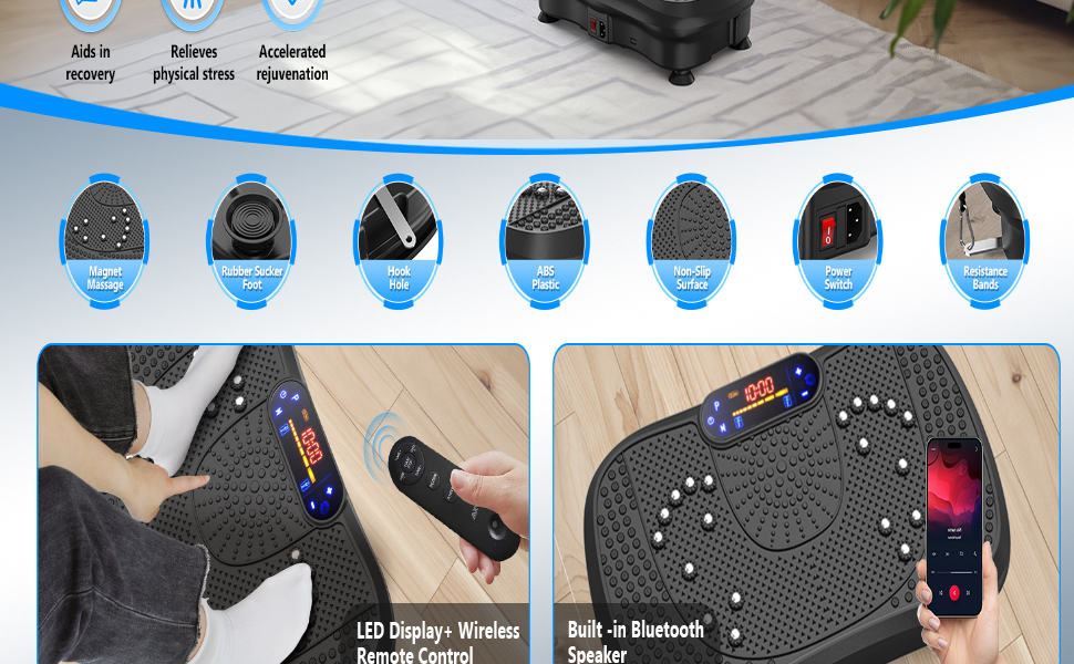 The AXV Exercise Equipment features a high-efficiency vibration platform with 120 adjustable speeds and dual resistance bands, designed to accelerate fat burning, enhance muscle tone, and improve lymphatic drainage. Bluetooth connectivity and an LED display provide smart workout tracking, while its compact, durable design ensures convenience and stability for daily full-body training and recovery.